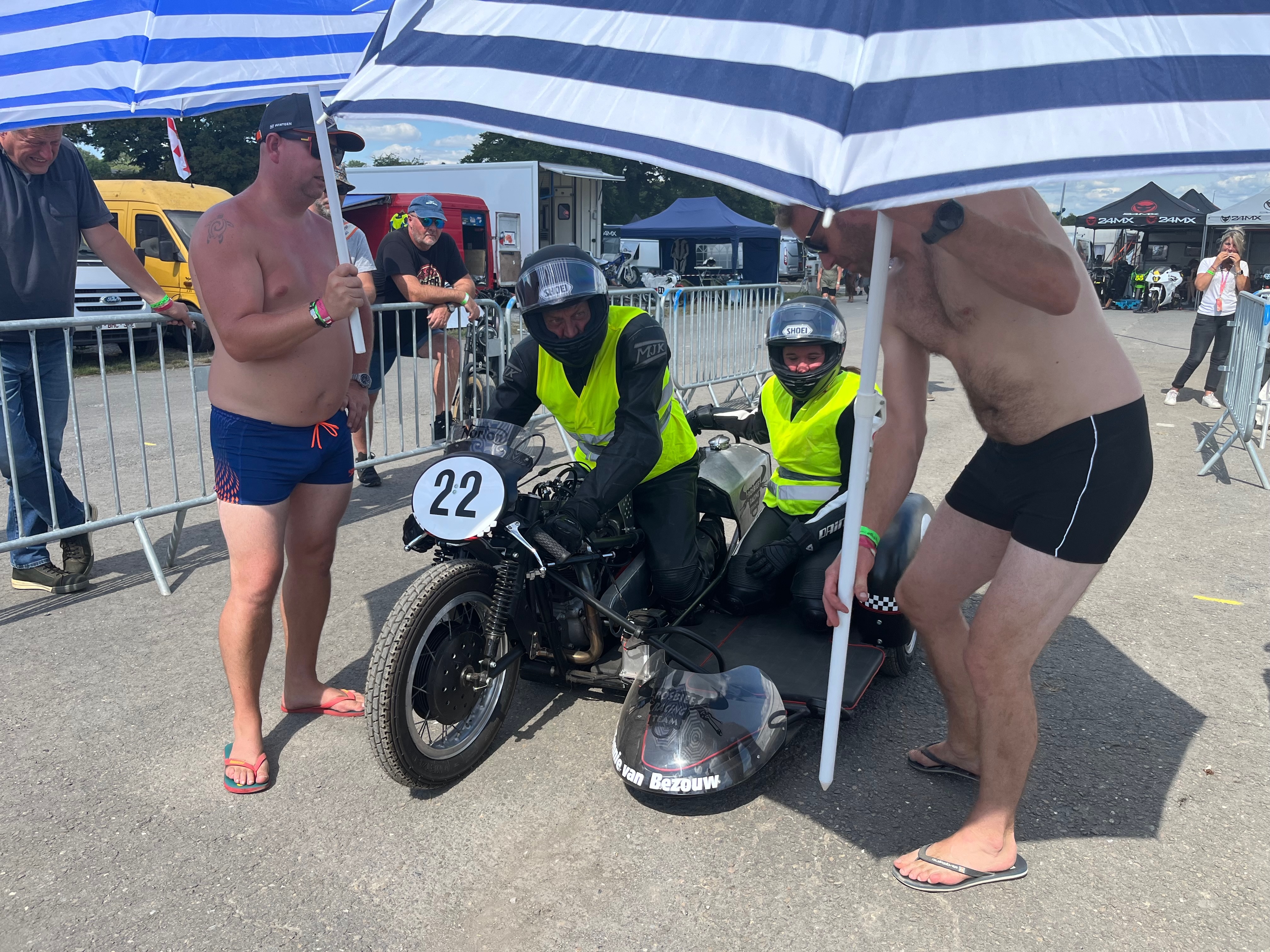 Zaterdagmiddag stond onze tweede training gepland. Maar omdat we in beide trainingen geen tijd gezet hadden (in de eerste training hebben we alleen de opwarmronde uitgereden, in de tweede zelfs dat niet) mochten we eigenlijk niet meedoen met de wedstrijden. Een praatje met de directeur de course loste dat gelukkig op. Net als op Chimay moest er een kruis door ons nummer en mochten we niet meedoen voor het podium, maar dat zouden we toch al niet halen. Als we maar kunnen rijden! Ook hier bleek namelijk weer dat er een enorme kloof zit in het technische kunnen van ons zijspan en onze rijervaring, vergelijken met de andere spannen in de klasse. Als we wel een tijd gezet hadden, was het nog maar de vraag of die snel genoeg geweest was voor kwalificatie.