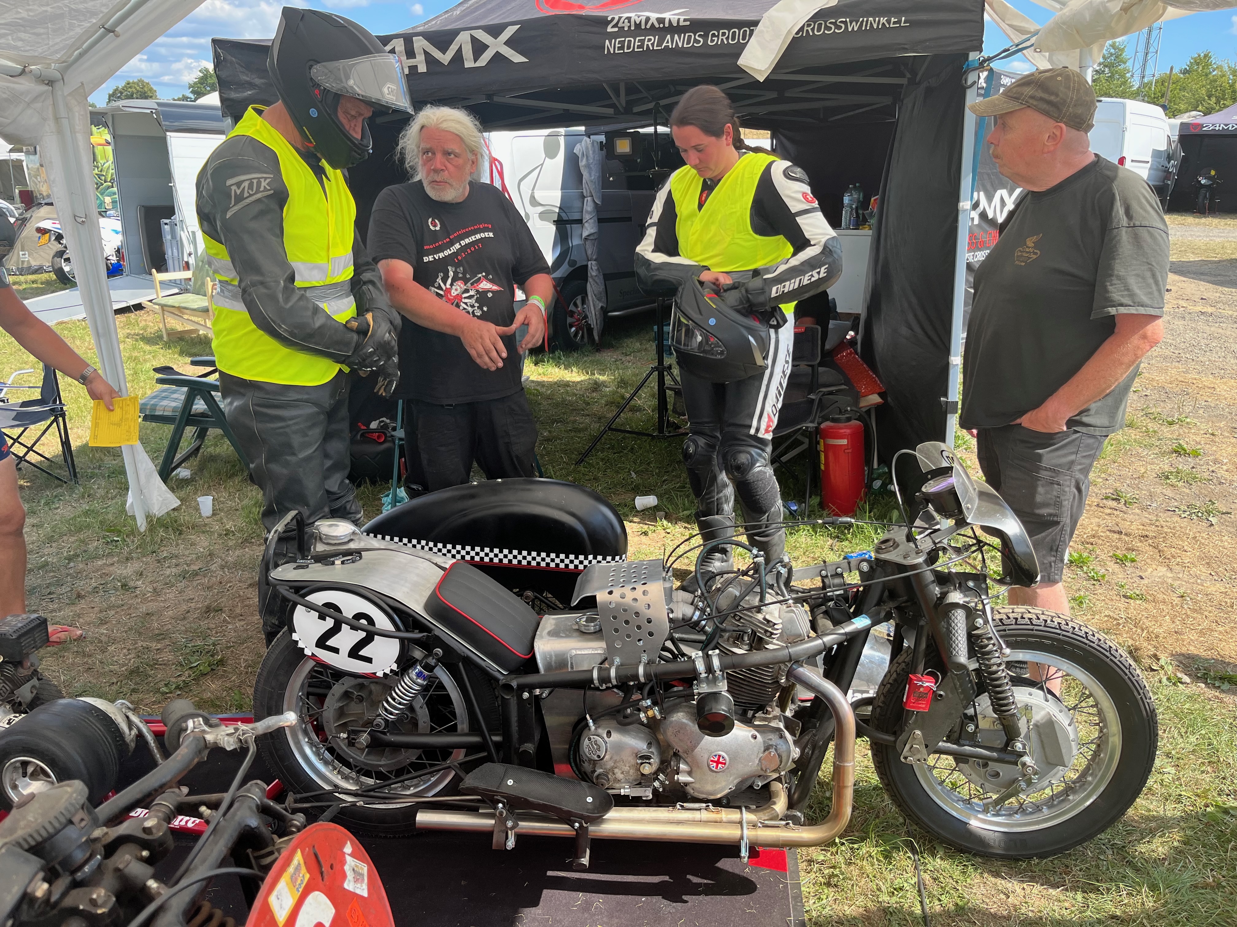Heel even leek het er op dat we de races zondag niet mochten rijden. We hadden ons namelijk niet gekwalificeerd. Ons zijspan bleek technisch gezien toch wel een flinke achterstand te hebben op die van onze concullega's (met zwaar getunede (auto)blokken, dubbele schijfremmen en geremde bakwielen) en onze rijvaardigheid laat uiteraard ook nog te wensen over, waardoor we bijna twee keer langer over een ronde deden dan de nummer 1. Gelukkig was daar Rutger, die de organisatie wist over te halen ons toch mee te laten doen met de races op zondag.