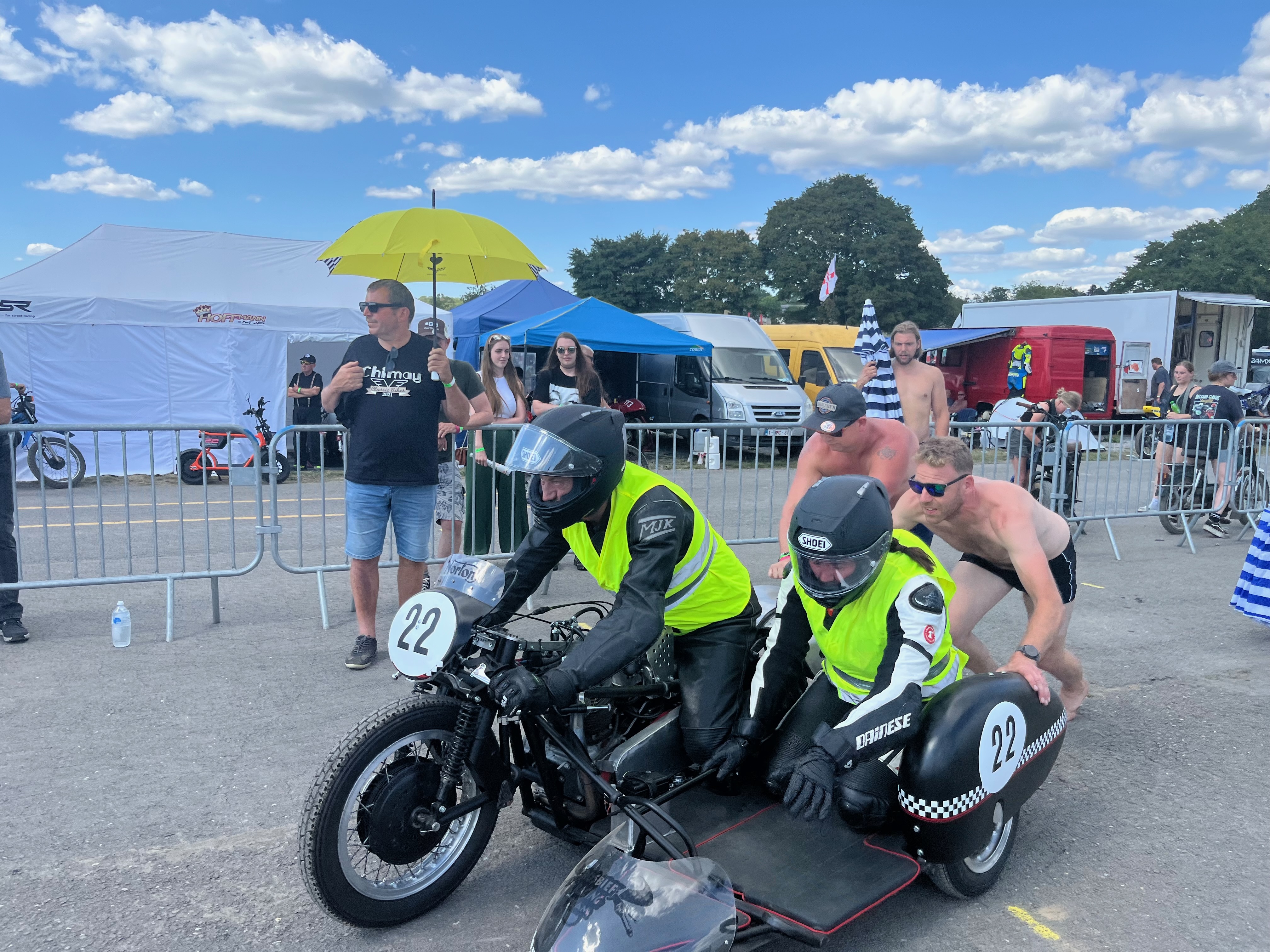 Het lijkt me fantastisch om zelf mee te rijden. Mijn op de DVD tot caféracer omgebouwde Honda CB500 Twin uit 1976 zou perfect zijn voor de parade. Mijn (mannelijke) pitspoezen staan al jaren in de startblokken, maar ik heb helaas niet genoeg vertrouwen in mijn eigen rijkunsten om het circuit op te gaan. Totdat de mogelijkheid van het zijspanracen zich een paar maanden geleden voordeed.